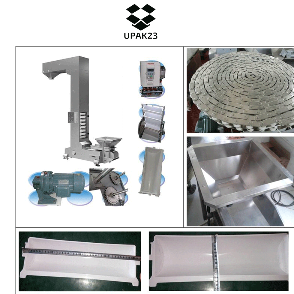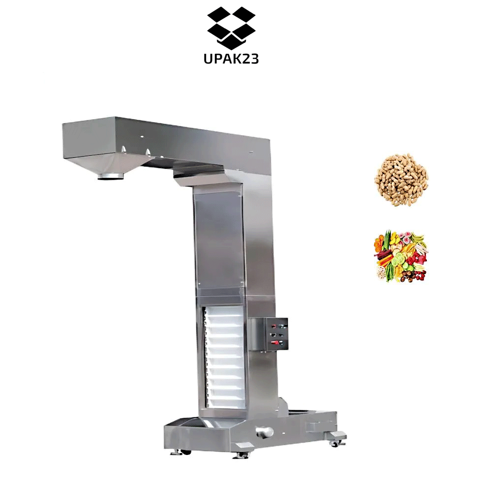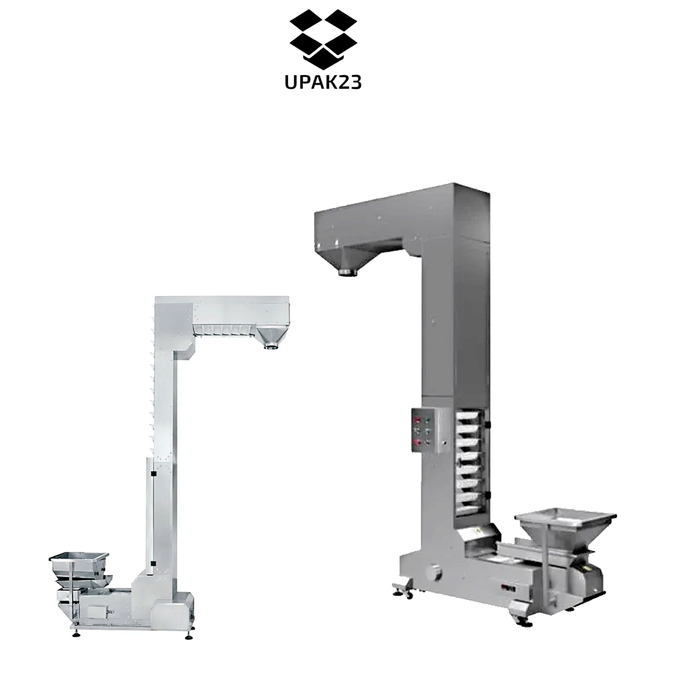 Подающий ковшовый транспортер служит для подъема сыпучих продуктов в зону дозирования на фасовочно-упаковочный автомат или дозатор. Подъемник имеет Z-образную форму, состоит из горизонтальных и вертикальной частей, вибробункера загрузки и панели управления. Пульт управления позволяет регулировать скорость подачи, а так же, позволяет работать как в ручном режиме (вкл/выкл), так и в автоматическом режиме по сигналу от датчика упаковочной машины или дозатора. Загрузчик Z-типа используется в пищевой, химической, сельскохозяйственной и фармацевтической промышленностях, при упаковки и фасовки различных материалов, таких как - крупы, печенья, орехи, конфеты, корма для животных, чипсы и снеки и т.д.Чаще всего подъемник сырья используется с мультиголовочными и весовыми дозаторами, фасовочно-упаковочными автоматами, для постоянного поддержания необходимого уровня вещества в нем. Преимущества:- закрытая система ковшовой транспортировки не допускает рассыпание продукта;