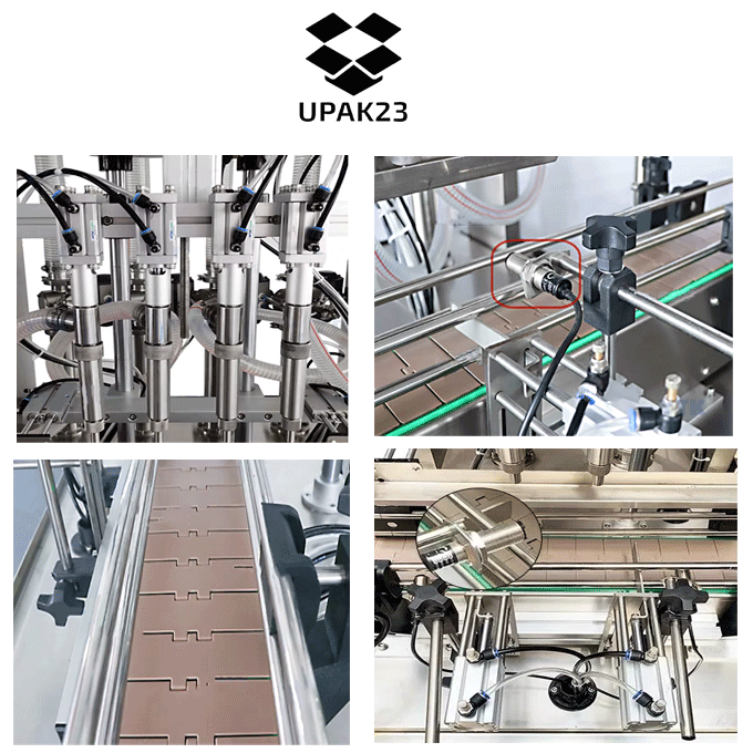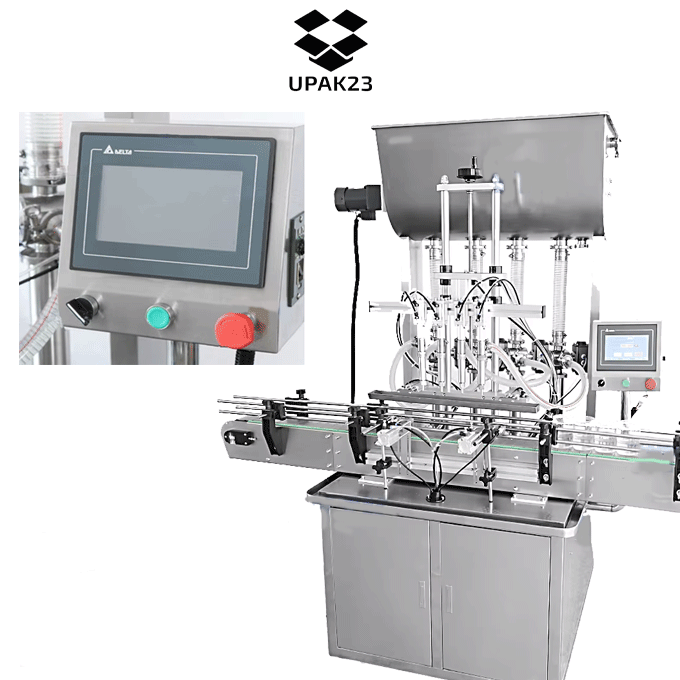 Узел розлива оснащён цифровой панелью управления, поршневым дозатором, оптическим датчиком определения тары, пневмоограничителями и конвейером. В загрузочном бункере объемом 180 литров, функция автоматического каплесборника (уловителя капель), для лучшего дозирования.